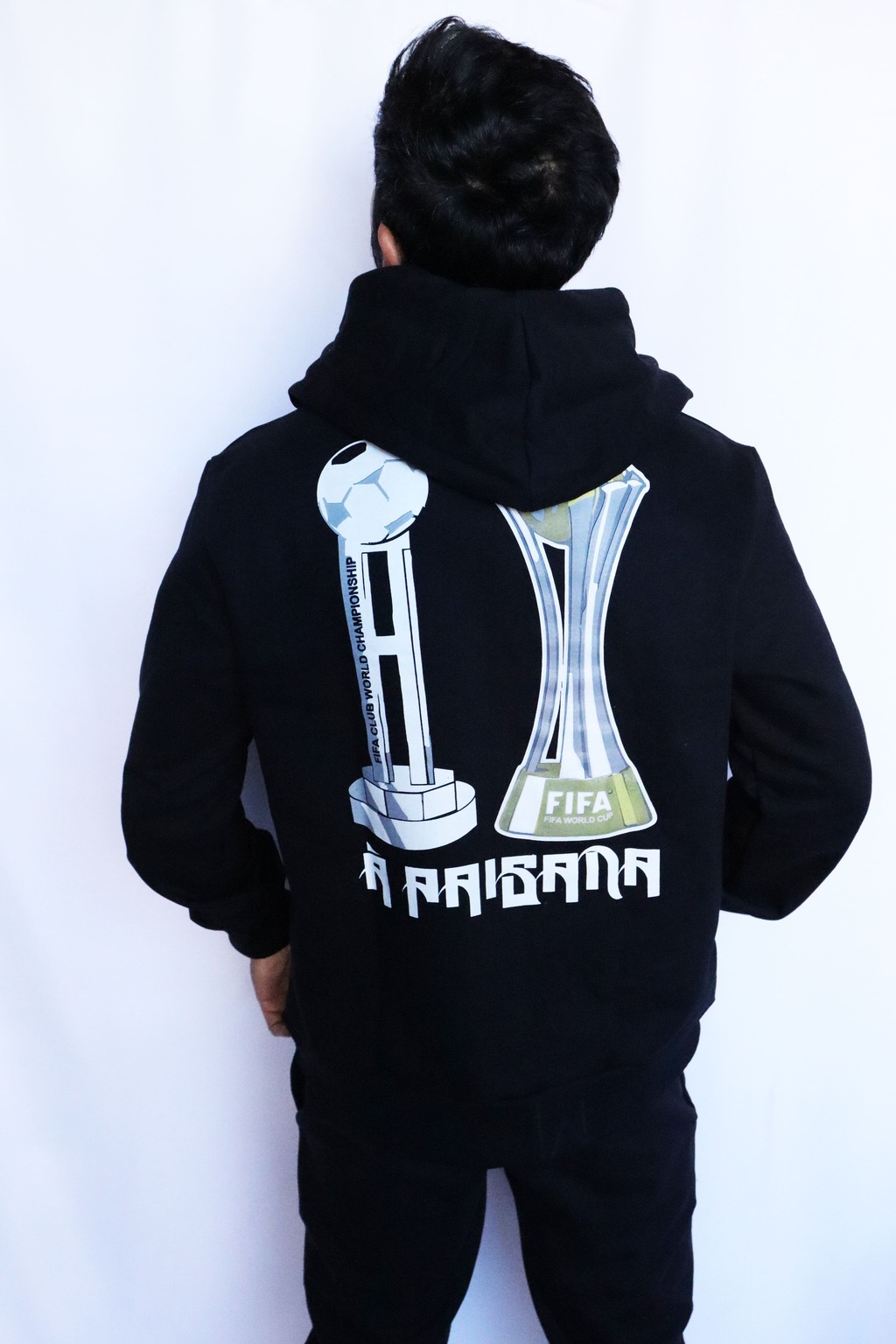 As duas taças conquistadas nos títulos mundiais estampada nas costas.